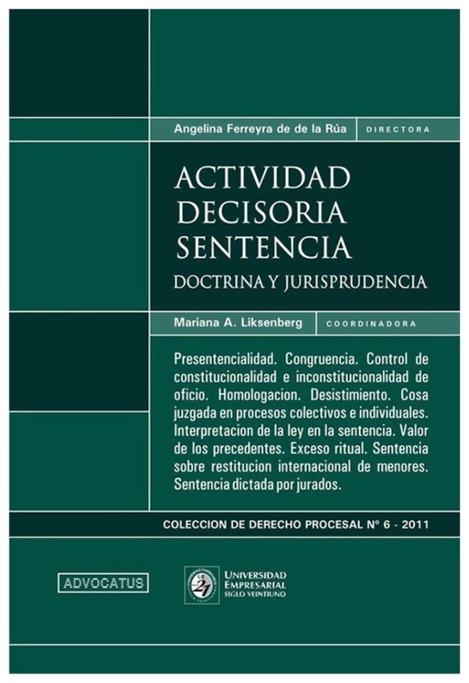 Prologo, por Ferreyra de De la Rua, Angelina. La concreta construccion de la decision final, por Arriola, Carolina. Presentenciabilidad penal y duracion razonable del proceso, por Asrin, Patricia V. Homologacion, por ferreyra de De la Rua, Angelina. Control de congruencia en los tribunales superiores, por Esperanza, Silvia S. Desistimiento y sentencia. De vinculaciones y exclusiones, por Gonzalez Castro, Manuel A. Claroscuro de la Corte Suprema de Justicia de la Nacion en la declaracion de inconstitucionalidad de oficio, por Gonzalez de la Vega, Cristina E. Kaminker, Mario E. El monto de la sentencia, por Gonzalez Zavala, Rodolfo y Bellusci, Florencia. A proposito de la subsuncion legal como presupuesto del principio de congruencia y su recepcion en la sentencia. Las inconsistencias en relacion con los recaudos del pagare para habilitar la via ejecutiva, por Junyet Bas, Francisco y Garzino, Maria C. El contenido de la sentencia homologatoria como otorgamiento del imperius iudicis al concordato requiere del analisis de la legitimacion de los acreedores concurrentes como la propuesta conformada. A proposito de los elementos que integran y dan sustento al acto decisorio judicial, Junyet Bas, Francisco. La fuerza vinculante de los precedentes en el sistema juridico argentino, por Junyet Bas, Francisco. La fuerza vinculante de los precedentes en el sistema juridico argentino, por Liksenberg, Mariana A. Aclaratoria e interpretacion: limites, por Soledad Ogas, Lourdes M. Control de constitucionalidad y de convencionalidad, por Palacio de Caeiro, Silvia B. Las decisiones judiciales y el libre juego de los principio juridicos, por Piña, Maria del C. y Ledesma de Fuster, Patricia. Algunas reflexiones sobre la resolucion judicial, por Ricotini, Maria E. Limites legales, politicos y economicos a la interpretacion de la ley en la sentencia, por Rodriguez Juarez, Manuel E. Efectos de la cosa juzgada en los procesos colectivos, por Salgado, Jose M. Sentencia dictada por jurados, por Spinka, Roberta E. La sentencia en la restitucion internacional de menores, por Tagle de Ferreyra, Graciela. La congruencia en el proceso laboral, por Toselli, Carlos A. Decision y exceso ritual (Entre la irracionalidad y la irrelevancia de las reglas), por Zambiazzo, Mauricio G. La cosa juzgada, bisagra de la seguridad juridica y la justicia, por Zaragoza, Luis M. y Sanchez Latorre, Pablo.