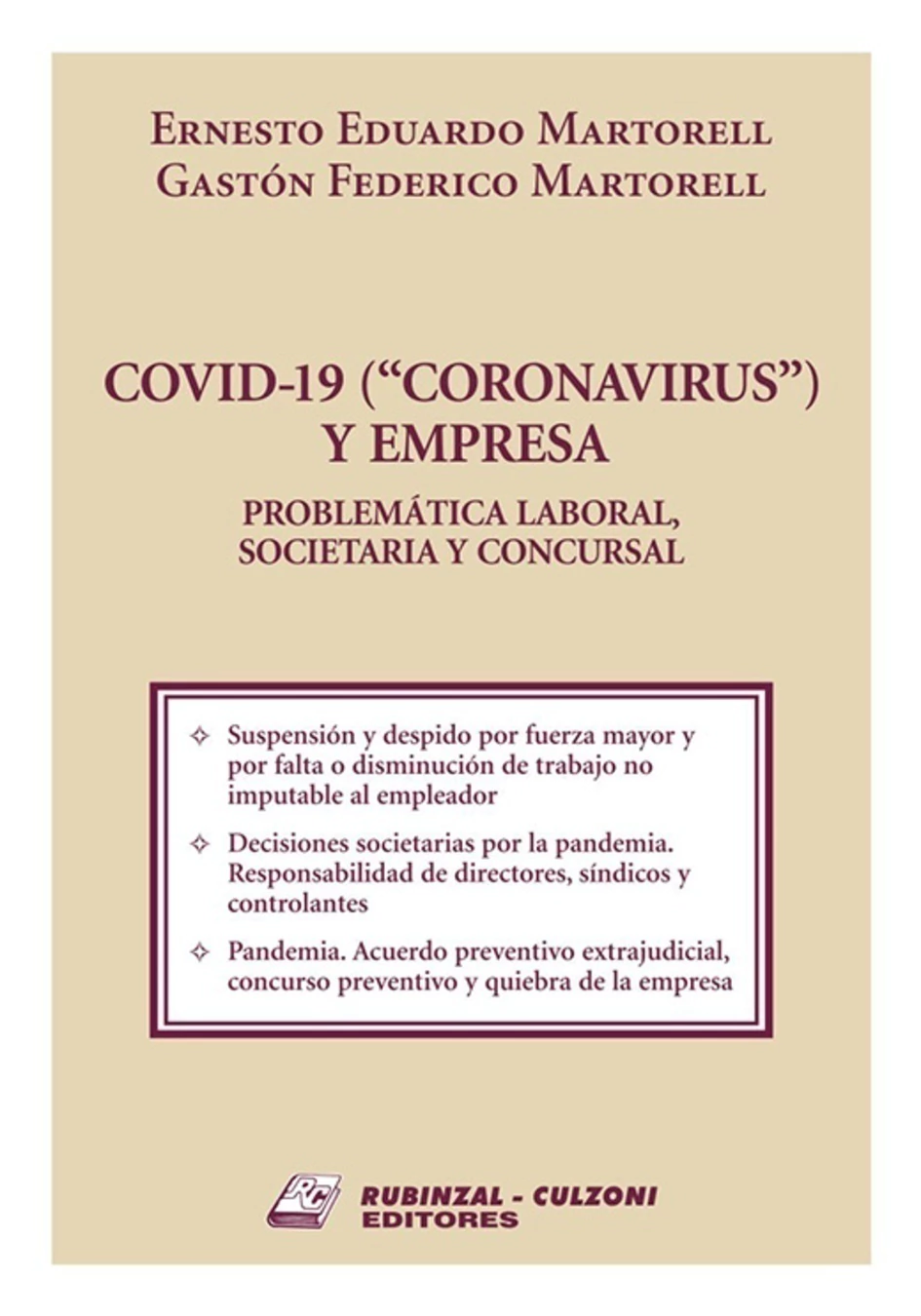 El COVID-19 o coronavirus. Qué repercusiones comunitarias causa el COVID-19. Coronavirus y economía. Situación de la República Argentina al arribo de la pandemia. Cómo tratar el coronavirus en la Argentina a nivel económico-social. El COVID-19 y sus efectos ante el universo jurídico. Empresa y sociedad. Orígenes de la noción de empresa. Concepto económico y jurídico. La empresa como comunidad de trabajo. Las teorías que han impactado en la noción de empresa: su consideración a partir del particular momento que vive el mundo y la República Argentina. Riesgos. Tratamiento de la empresa en la Ley de Contrato de Trabajo. La teoría de la continuación de la empresa. La sociedad comercial. Problemática laboral. Las relaciones laborales y el impacto de la pandemia. La llamada responsabilidad civil. El tratamiento de la fuerza mayor y de la falta o disminución del trabajo por el Derecho argentino. Coronavirus, fuerza mayor, falta o disminución de trabajo no imputable al trabajador. Cómo se debe o se puede proceder hoy. Problemática societaria. Estructura y funcionamiento de la sociedad comercial. Parámetros de responsabilidad. Situaciones pasibles de problemática vinculada al coronavirus. El impacto de la crisis motivada por el COVID-19 sobre los balances de ejercicio. La aparición de un nuevo colectivo legitimado para accionar en materia mercantil: el Estado y los trabajadores perjudicados. Problemática concursal. La temática concursal en el mundo. Diferencias existentes entre el llamado derecho de la ejecución colectiva y el derecho de la ejecución individual. La insolvencia. Operatividad de las figuras concursales. Lo que se busca con los procesos concursales y paraconcursales. La empresa en crisis por el COVID-19 y el Derecho Concursal. Anexos: Digesto de emergencia sanitaria coronavirus COVID-19. Decretos de Necesidad y Urgencia. Reglamentación completa. Circulares y Comunicaciones con información y medidas adoptadas por el Banco Central de la República Argentina en tiempos de coronavirus. Acordadas emitidas por la Corte Suprema de Justicia de la Nación en tiempos del COVID-19. Jurisprudencia relativa al coronavirus.