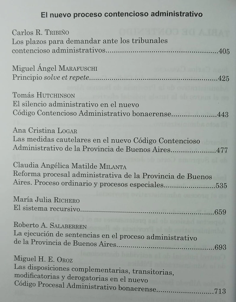 El silencio administrativo en el nuevo Código Contencioso Administrativo bonaerense, Tomás Hutchinson. Las medidas cautelares en el nuevo Código Contencioso Administrativo de la Provincia de Buenos Aires, por Ana C. Logar. Reforma procesal administrativa bonaerense. Proceso ordinario y procesos especiales, por Claudia A. Milanta. Sistema recursivo, por María J. Richero. La ejecución de sentencias en el proceso administrativo de la Provincia de Buenos Aires, por Roberto A. Salaberren. Las disposiciones complementarias, transitorias y derogatorias en el nuevo Código Procesal Administrativo bonaerense, por Miguel H. Oroz. Apéndice legislativo.