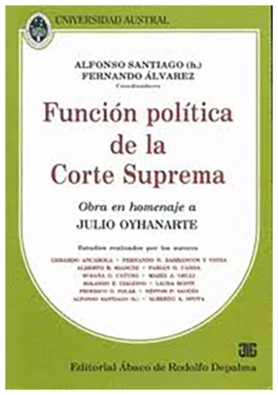 Función política de la Corte Suprema. Obra en homenaje al Dr. Julio Oyhanarte. El poder político de la Corte Suprema de los Estados Unidos. Los modelos institucionales de Corte Suprema. La Corte y los conflictos de poderes. El papel político de la Corte en las crisis institucionales. La Corte y la vigencia del estado constitucional de derecho: guardiana del proceso político y tribunal de garantías constitucionales. La función política de la Corte en los gobiernos de facto. La Corte y el ejercicio de funciones discrecionales. La función política de la Corte, el juicio político y los jurados de enjuiciamiento de magistrados y funcionarios. ¿Retrocede el reloj jurídico de la Corte en materia de control de los decretos de necesidad y urgencia? Análisis de la razonabilidad de las reglamentaciones de los derechos personales. Las Cortes Constitucionales y los derechos económicos y sociales. La Corte y el derecho a conocer la verdad. Por los autores: G. ANCAROLA, F. N. BARRANCOS Y VEDIA, A. B. BIANCHI, F. O. CANDA, S. G. CAYUSO, M. A. GELLI, R. E. GIALDINO, L. MONTI, F. G. POLAK, N. P. SAGÜÉS, A. SANTIAGO (h.), A. A. SPOTA. 2000, 303 ps.