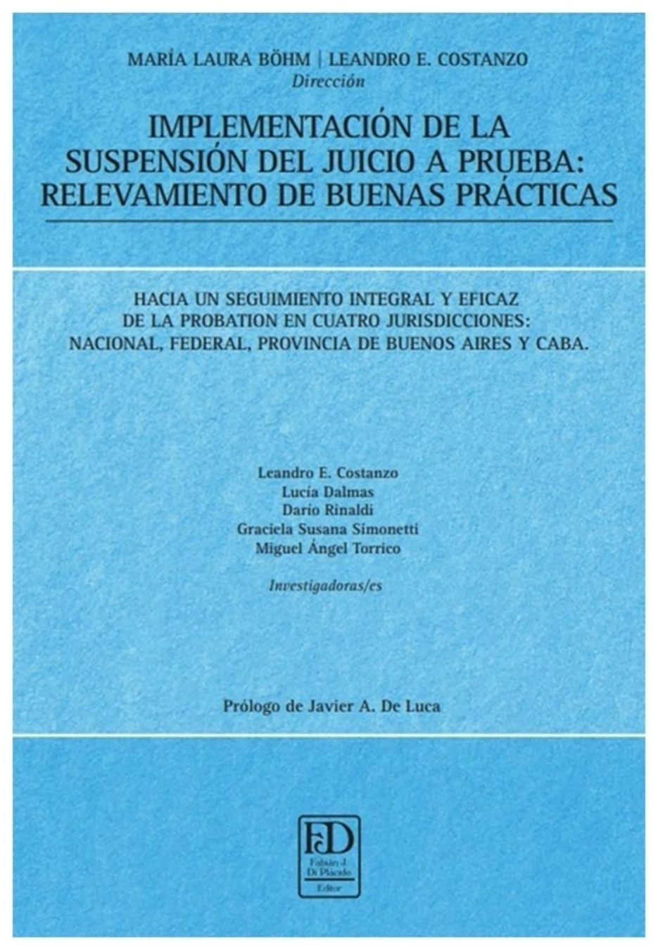 Prólogo. DESCRIPCIÓN DEL PROYECTO. Introducción. Conclusiones del proyecto anterior, diagnóstico previo a esta investigación y objetivos. Introducción básica conceptual y descripción del proyecto 26. La probation argentina. Estado actual del conocimiento. Datos. Buenas prácticas. Acercamiento teórico conceptual. Método y estructura de la investigación. PRIMERA ETAPA: TRABAJO EXPLORATORIO EN ORGANISMOS INTERVINIENTES. DESCRIPCIÓN DE SU INTERVENCIÓN Y PRIMEROS ACERCAMIENTOS A LAS BUENAS PRÁCTICAS. Introducción a la tarea de exploración. Entrevistas y acercamientos exploratorios. Ámbito de la Justicia Nacional. Reunión con la Unidad Fiscal de Medidas Alternativas al Proceso Penal con Intervención en el Control y Seguimiento de las suspensiones del proceso a prueba, Abog. Sheila De Elia Otero. Introducción. Entrevista. Reunión con personal de la Unidad de Letrados Móviles para la Asistencia de las Personas no Privadas de Libertad de la Defensoría General de la Nación. Introducción. Entrevista. Ámbito de la Justicia Nacional y Federal. Intercambio con la Directora de la Dirección de Control y Asistencia de Ejecución Penal (DCAEP). Abog. María Virginia Barreyro. Introducción. Entrevista. Ámbito de la Justicia Nacional y Federal (con presencia en otras jurisdicciones). Reunión con el titular de la Dirección General de Acceso a la Justicia del Ministerio Público Fiscal de la Nación (ATAJO), Abog. Julián Axat. Introducción. Entrevista. Ámbito de la provincia de Buenos Aires. Reunión con la Trabajadora Social del Patronato de Liberados Bonaerense, Licenciada Graciela Simonetti. Introducción. Entrevista. Juzgado de primera instancia de Garantías N° 1 de Lomas de Zamora, Departamento Judicial de Lomas de Zamora (Juez Jorge Walter López): Protocolo de trabajo y seguimiento de la suspensión del proceso a prueba. Introducción. Evaluación exploratoria. Ámbito de la CABA. Reunión con el titular de la Oficina de Control de Suspensión del Proceso a Prueba del MPF, Abog. Santiago Cafferata. Introducción. Entrevista. Reunión con una operadora del Patronato de Liberados de la CABA. Introducción. Entrevista. Conclusión preliminar. SEGUNDA ETAPA. RELEVAMIENTO DE BUENAS PRÁCTICAS. Introducción. Entrevistas. Justicia Nacional. Entrevista con la titular del Juzgado Nacional de Ejecución Penal N° 5 Jueza Abog. Jimena Monsalve. Introducción. Entrevista. Justicia de la Provincia de Buenos Aires. Entrevista con profesionales que desarrollan su labor en la Oficina de Coordinación Institucional con el Patronato de Liberados Bonaerense del Ministerio Público (Nuevas oficinas de control de Suspensión del Proceso a Prueba). Introducción. Entrevista a profesional C. Entrevista a profesional L. Justicia de CABA. Entrevista con titular de la Oficina de Control de Suspensión del Proceso a Prueba del Ministerio Público Fiscal de la CABA, Lic. Fabricio Pizzarello. Introducción. Entrevista. Entrevista con una trabajadora del Patronato de Liberados de la CABA. Introducción. Entrevista. Jurisdicción Federal (en CABA). Entrevista al juez Ricardo Ángel Basílico, presidente del Tribunal Oral en lo Criminal Federal Nº 1 de Capital Federal. Introducción. Entrevista. TERCERA ETAPA: SISTEMATIZACIÓN DE DIFICULTADES, BUENAS PRÁCTICAS Y PROPUESTAS. Introducción. Justicia Nacional. Jurisdicción de la Provincia de Buenos Aires. Jurisdicción de CABA. Jurisdicción Federal. CONCLUSIONES. Bibliografía. ANEXOS 1. Cuestionario utilizado como guía para la entrevista de operadoras y operadores. Anexo 2. Protocolo de trabajo del Juzgado de Garantías N° 1 del Departamento Judicial Lomas de Zamora. Anexo 3. Reporte de validación como buena práctica. Anexo 4. Protocolo de trabajo MPF CABA. Resolución FG 078-08. Anexo 4 b. Anexos. Resolución FG 078-08. Anexo 5. Propuesta de creación de un centro de almacenamiento de telefonía celular para el seguimiento.