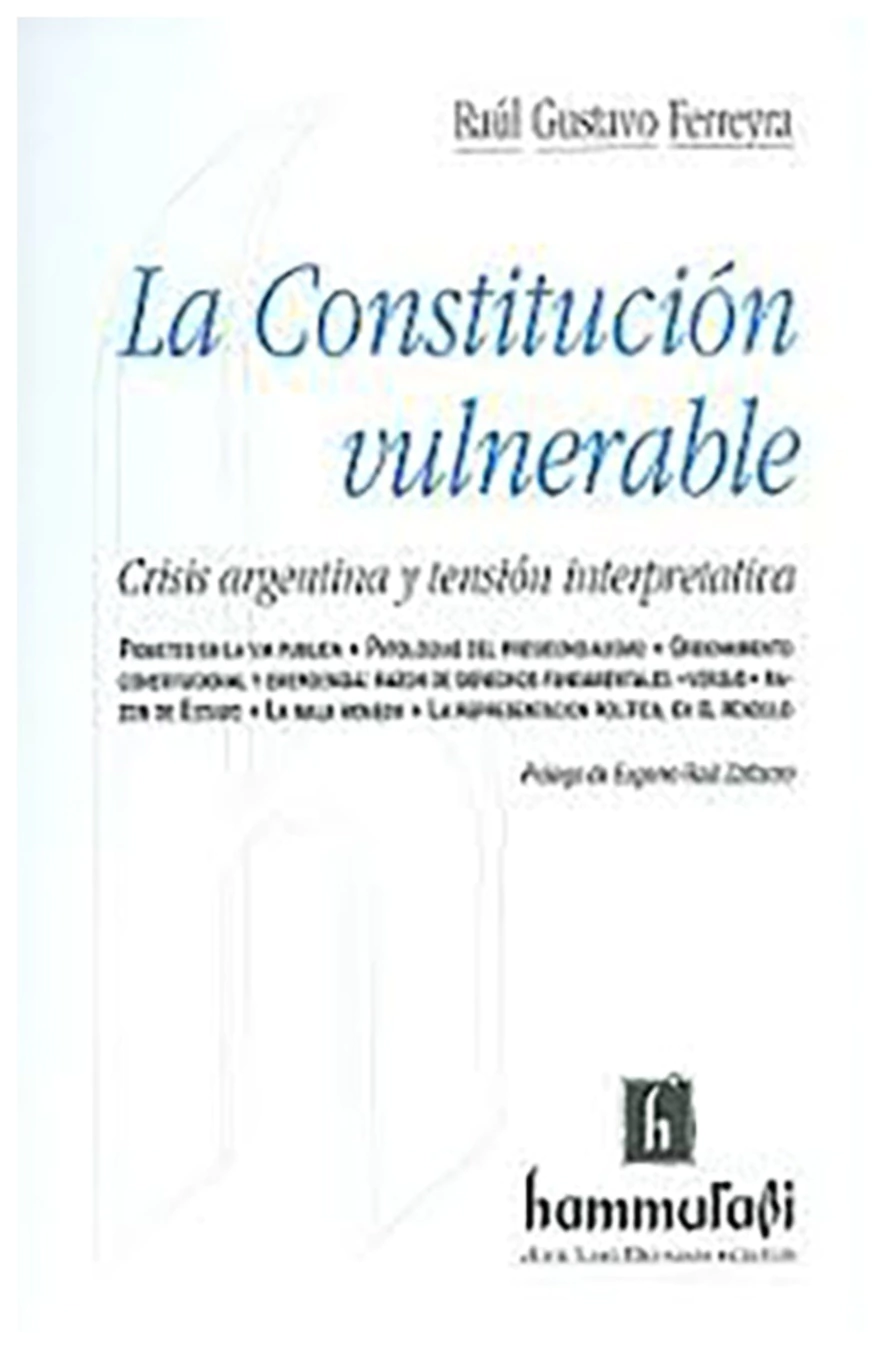 La constitución vulnerable. Crisis argentina y tensión interpretativa. Prólogo de Eugenio R. Zaffaroni. TENSION ENTRE PRINCIPIOS CONSTITUCIONALES. A propósito de los "piquetes" en la via publica: ¿abuso o ejercicio regular de los derechos constitucionales que parecen antagonizar?. CRISIS DE LAS POTESTADES DEL CONGRESO. Patologias del sistema de gobierno presidencialista argentino. ESTADO CONSTITUCIONAL ARGENTINO 2002: ¿INVOLUCION HACIA LA EMERGENCIA INFINITA?. Un relato sobre las relaciones entre la regla del reconocimiento conceptual basica y el orden constitucional. NOTA SOBRE EL REGIMEN DE LA MALA MONEDA. Sobre una sentencia de la Suprema Corte de Justicia de la provincia de Buenos Aires. SOBRE LAS CANDIDATURAS ELECTORALES INDEPENDIENTES DE LOS PARTIDOS POLITICOS. Bibliografia.
