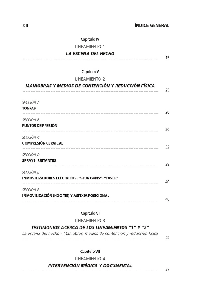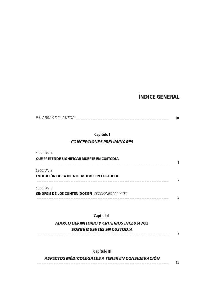 Conceptos generales - Marco definitorio y criterios inclusivos sobre muertes en custodia - Aspectos médico-legales a considerar la escena del hecho - Maniobras y medios de contención y reducción física - Intervención médica y documental - Autopsia - Tortura - Incidencia de alcohol y drogas de abuso