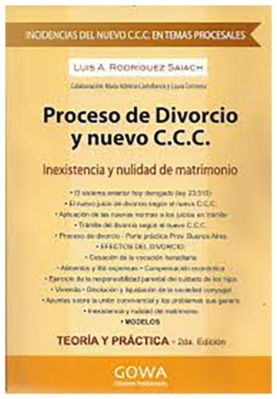 El sistema anterior hoy derogado (ley 23.515). El nuevo juicio de divorcio segun el nuevo CCC. Aplicacion de las nuevas normas a los juicios en tramite. Tramite del divorcio segun el nuevo CCC. Proceso de divorcio. Parte practica provincia de Buenos Aires. Efectos del divorcio. Cesacion de la vocacion hereditaria. Alimentos y litis expensas. Compensacion economica. Ejercicio de la responsabilidad parental del cuidado de los hijos. Vivienda. Disolucion yliquidacion de la sociedad conyugal. Apuntes sobre la union convivencial y los problemas que genera. Inexistencia y nulidad del matrimonio. Modelos.