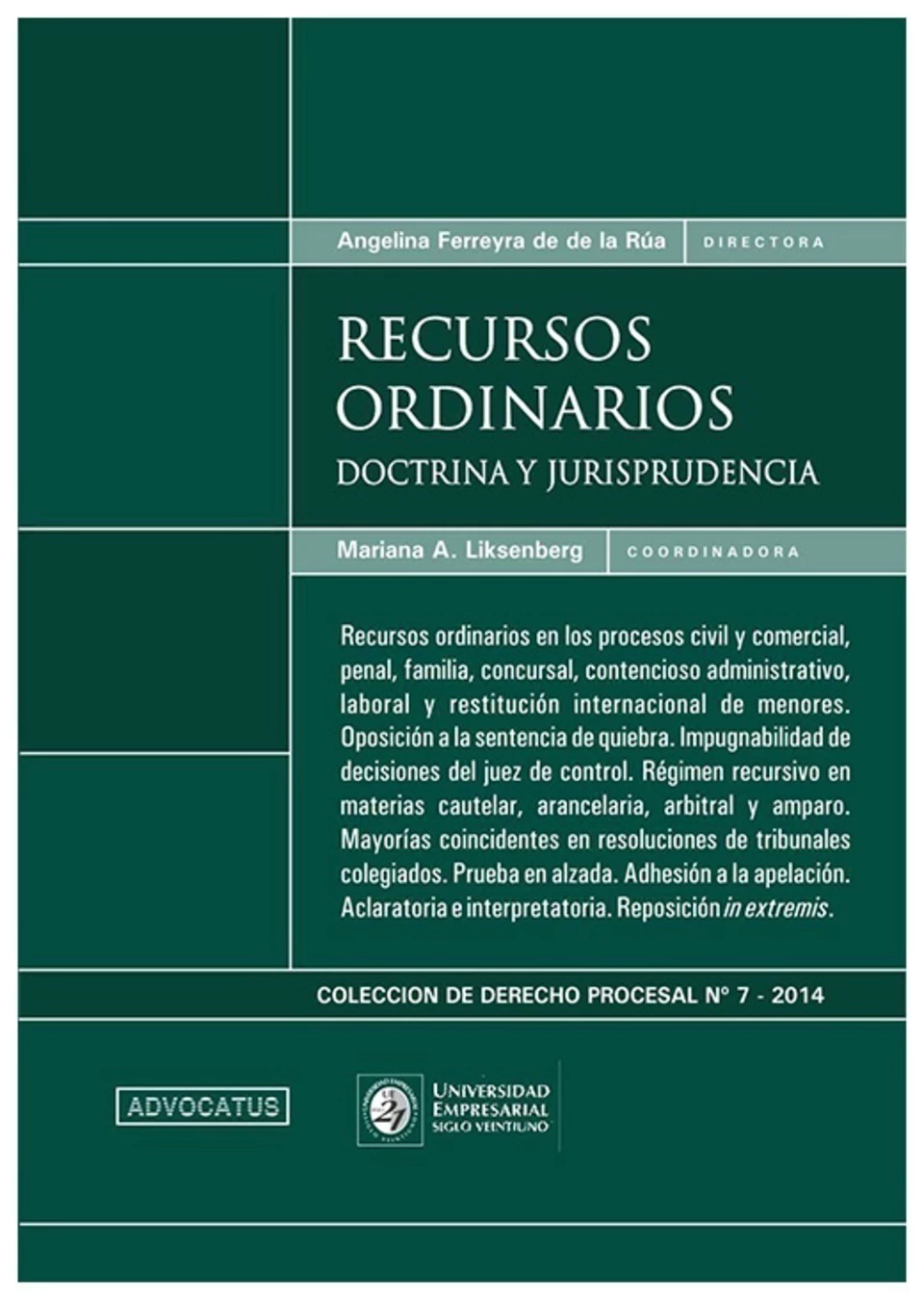 Recursos ordinarios en los procesos civil y comercial, penal, familia, concursal, contencioso administrativo, laboral y restitución internacional de menores. Oposición a la sentencia de quiebra. Impugnabilidad de decisiones del juez de control. Régimen recursivo en materias cautelar, arancelaria, arbitral y amparo. Mayorías coincidentes en resoluciones de tribunales colegiados. Prueba en alzada. Adhesión a la apelación. Aclaratoria e interpretatoria. Reposición in extremis.